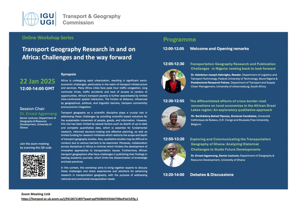 We are excited to invite you to the upcoming online workshop organized by the IGU Transport and Geography Commission focusing on ” Transport Geography Research in and on Africa: Challenges and the Way Forward.